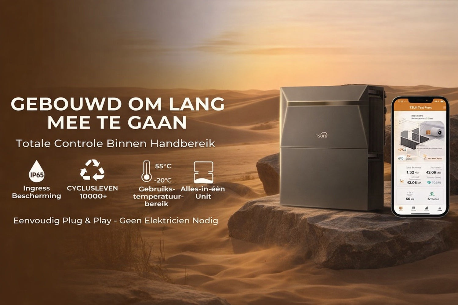 Wij leveren plug-and-play thuisbatterijen van TSUN: slim, gebruiksvriendelijk en direct inzetbaar. De batterijen werken samen met de slimme meter en zijn geschikt voor zowel 1 fase als 3 fase meterkasten, zonder aanpassingen.